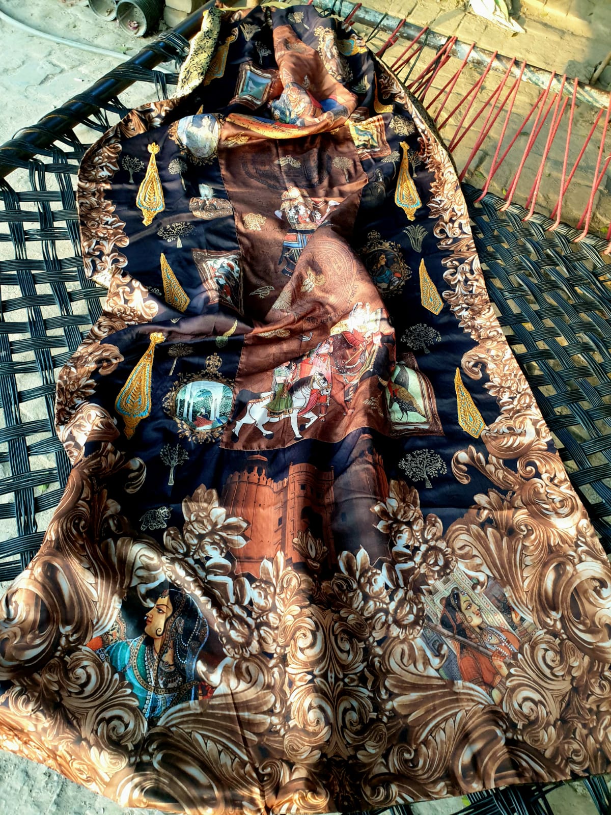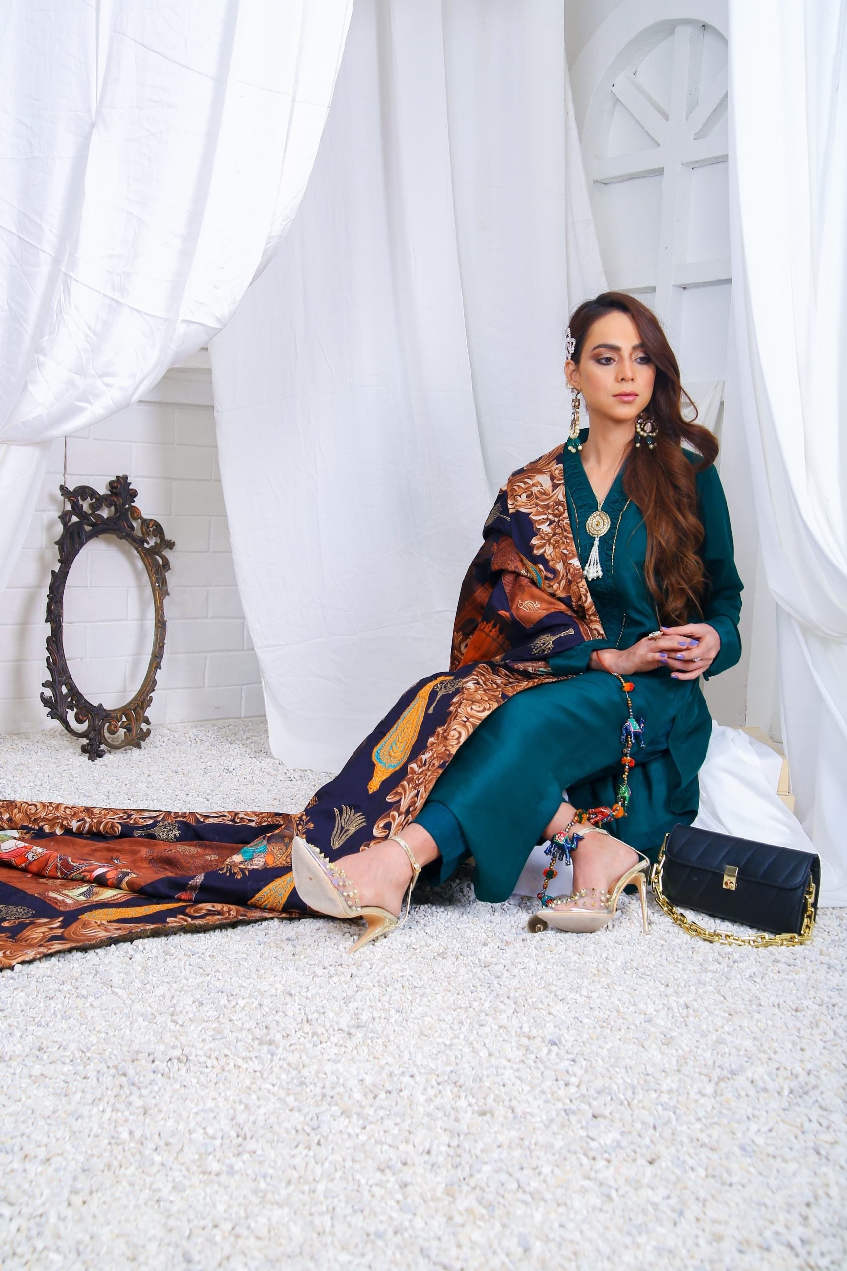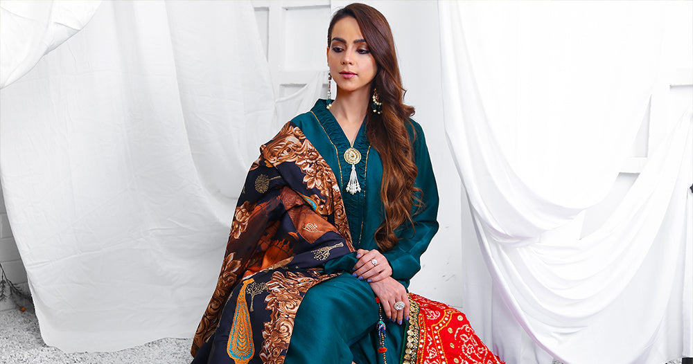The resham embroidered and hand painted details on a theme silk shawl is the heirloom touch.
